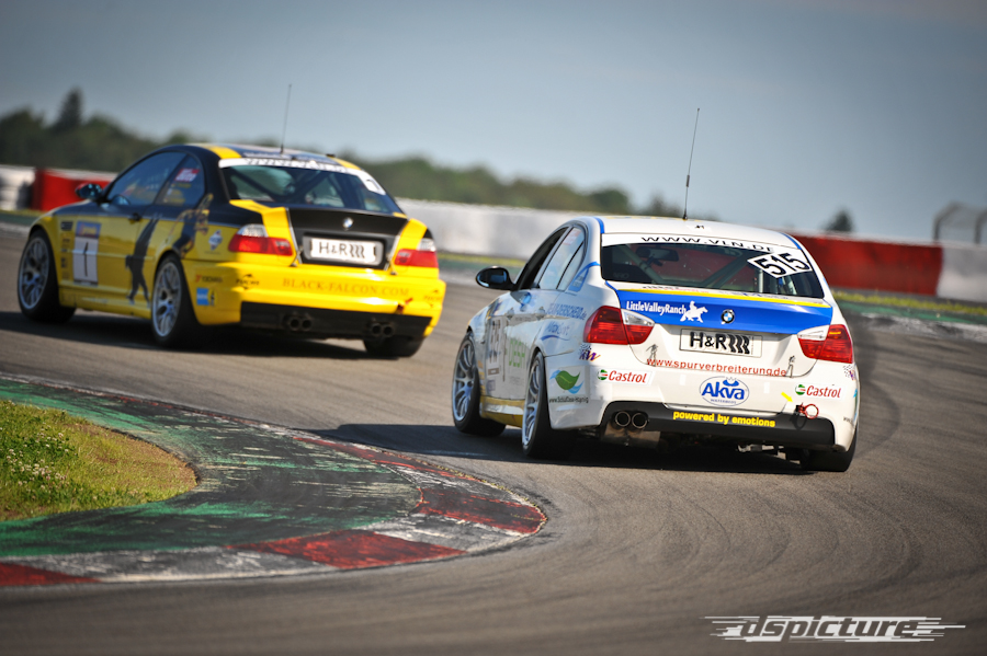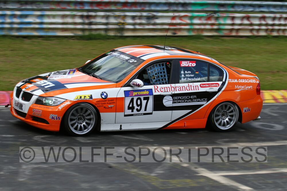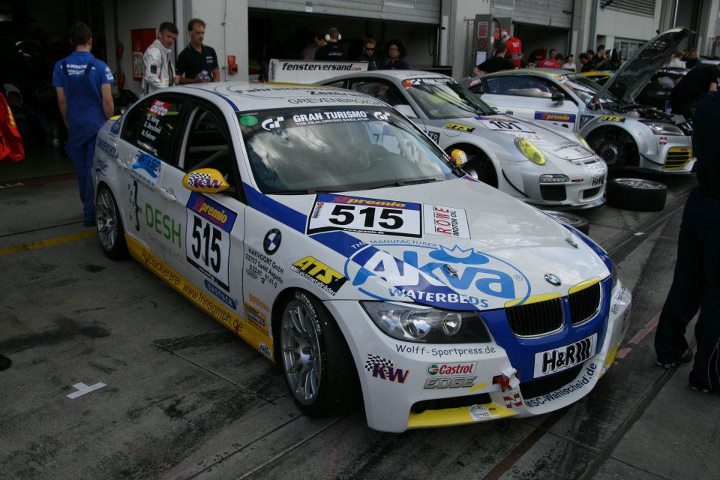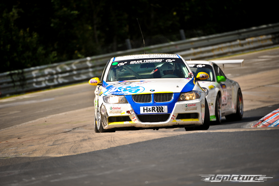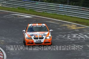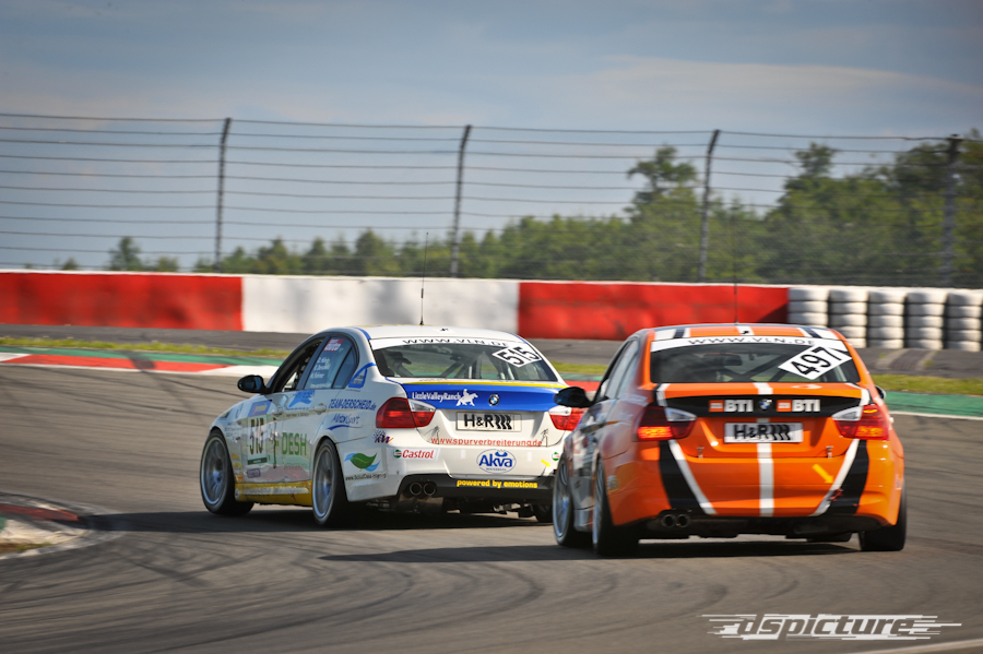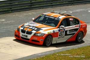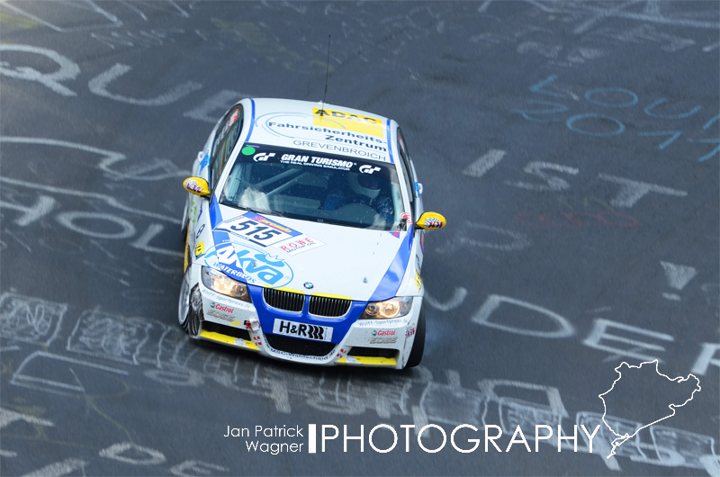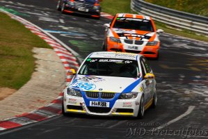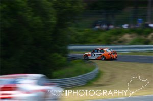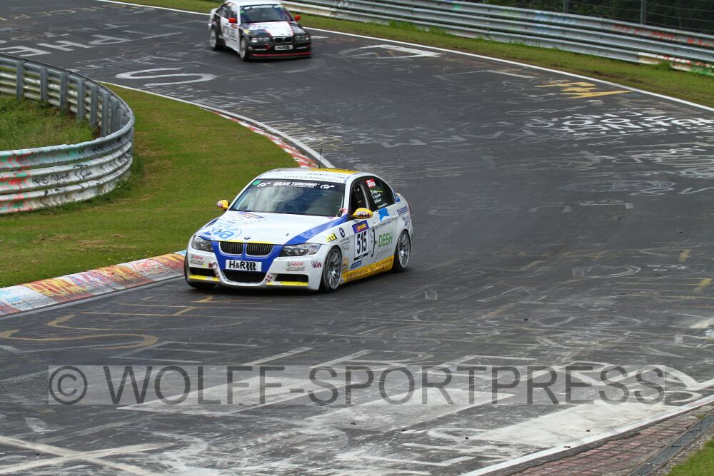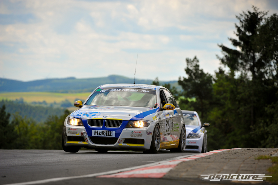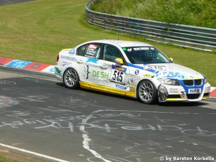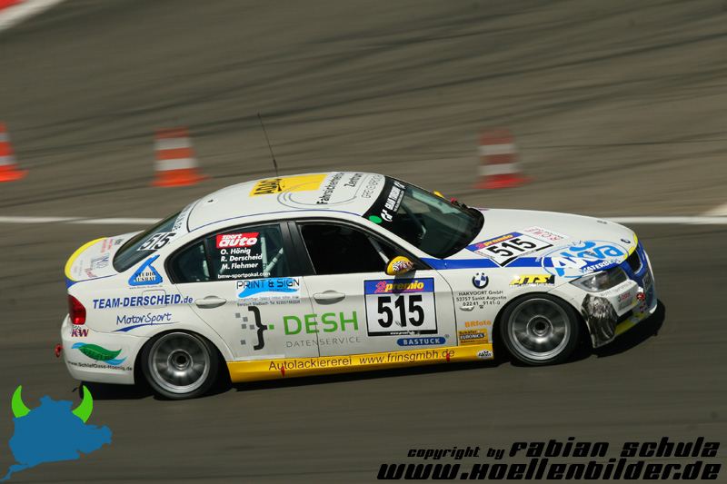 Nachdem das Zeittraining bei teils feuchter Strecke begonnen wurde, gestaltete sich die Jagd auf Bestzeiten zum Risiko. Einige Teams machten schon hier schlechte Erfahrung mit den Tücken der „Grünen Hölle“. Beim Motorsportteam Derscheid galt die Parole: Nicht´s riskieren, das Rennen dauert 4 Stunden! So stand das Fahrzeug mit der Startnummer 515, pilotiert von Rolf Derscheid, Michael Flehmer und Oliver Hönig auf der 5. Startposition der mit 12 Fahrzeugen besetzten Klasse. Auf Rang sechs folgte das zweite Fahrzeug des Team Derscheid, die Startnummer 497, diesmal pilotiert von Matthias Butz, Michael Flehmer und Rolf Derscheid. Sofort nach dem Start kam es in der ersten Startgruppe, der schnellsten Gruppe mit den GT3 Fahrzeugen im Bereich Fuchsröhre zu einer Unfallserie. Michael Flehmer, wie immer Startfahrer der Nummer 515, machte wie immer seinen guten Job, hatte aber während seines Stints einen leichten Kontakt mit einem anderen Fahrzeug. Dies blieb aber, außer etwas Reifengummi des Gegners an der Front ohne Folgen.