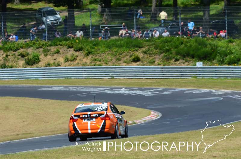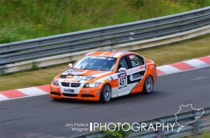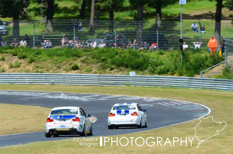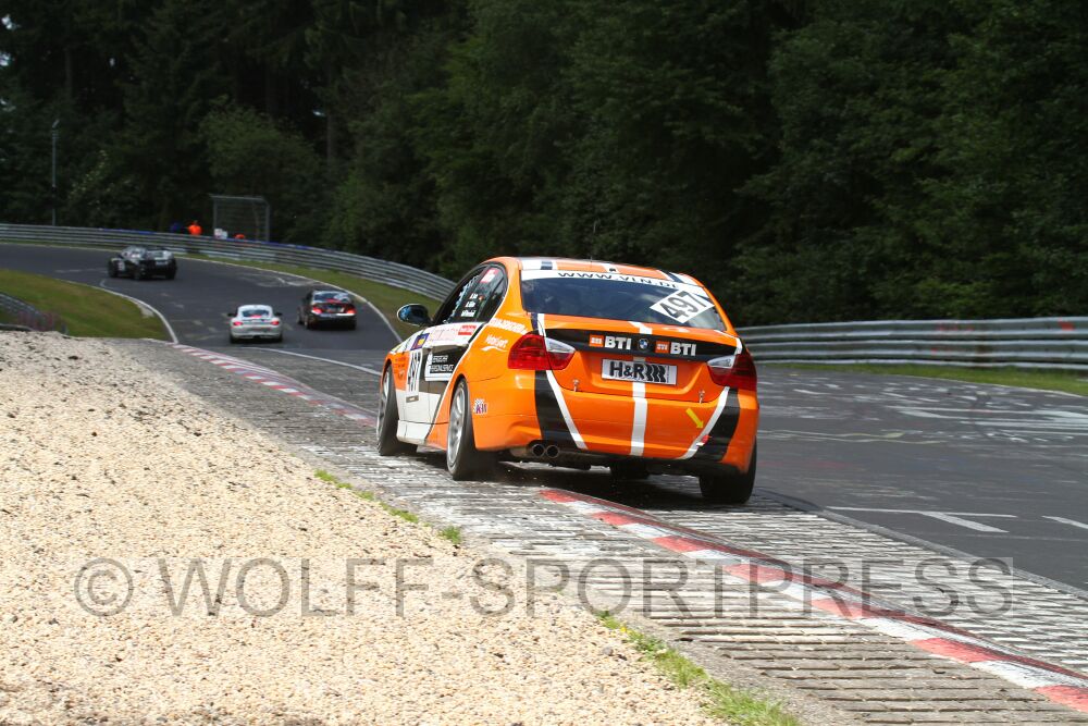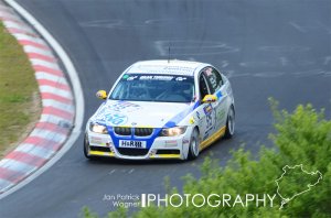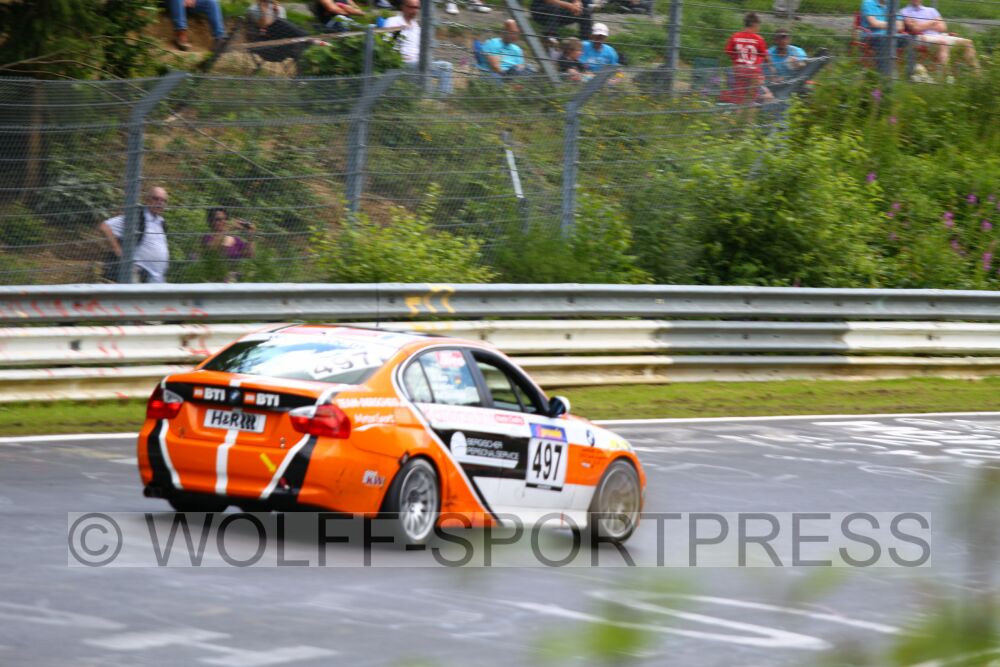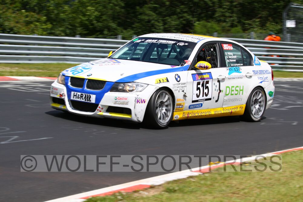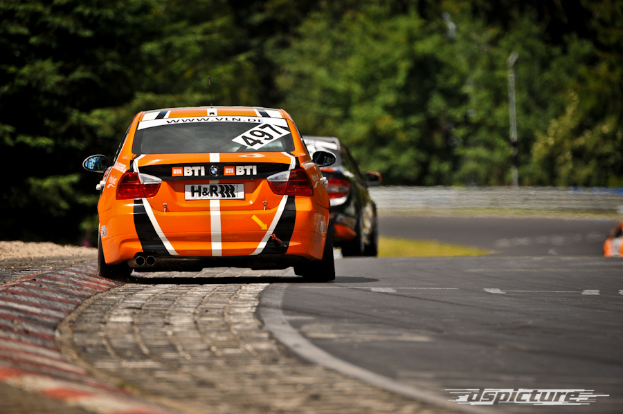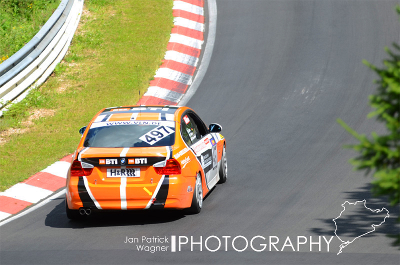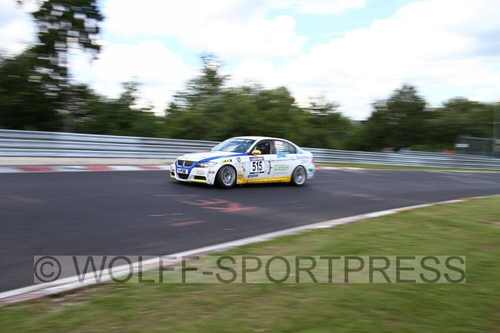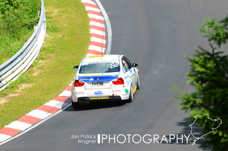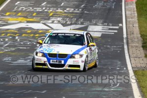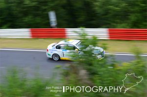 Nachdem das Zeittraining bei teils feuchter Strecke begonnen wurde, gestaltete sich die Jagd auf Bestzeiten zum Risiko. Einige Teams machten schon hier schlechte Erfahrung mit den Tücken der „Grünen Hölle“. Beim Motorsportteam Derscheid galt die Parole: Nicht´s riskieren, das Rennen dauert 4 Stunden! So stand das Fahrzeug mit der Startnummer 515, pilotiert von Rolf Derscheid, Michael Flehmer und Oliver Hönig auf der 5. Startposition der mit 12 Fahrzeugen besetzten Klasse. Auf Rang sechs folgte das zweite Fahrzeug des Team Derscheid, die Startnummer 497, diesmal pilotiert von Matthias Butz, Michael Flehmer und Rolf Derscheid. Sofort nach dem Start kam es in der ersten Startgruppe, der schnellsten Gruppe mit den GT3 Fahrzeugen im Bereich Fuchsröhre zu einer Unfallserie. Michael Flehmer, wie immer Startfahrer der Nummer 515, machte wie immer seinen guten Job, hatte aber während seines Stints einen leichten Kontakt mit einem anderen Fahrzeug. Dies blieb aber, außer etwas Reifengummi des Gegners an der Front ohne Folgen.