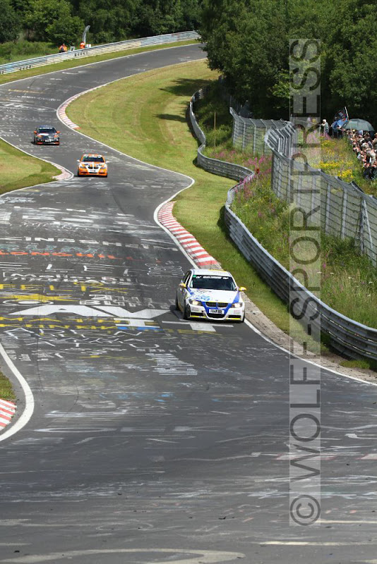 So schmolz der Vorsprung immer weiter dahin. Zwei Runden vor Rennende waren nur noch 13 Sekunden dieses Vorsprungs vorhanden. Es hätte reichen können. Doch dann kamen von hinten die späteren Sieger, der Mercedes SLS vom ROWE Team mit Roloff/Seyffarth und der Manthey Porsche mit Krumbach/Lieb. Derscheid versuchte die Beiden nicht zu behindern und verließ kurz die Ideallinie - mit schlimmen Folgen. Er schlug hart in die Leitschienen ein, das Fahrzeug war nicht mehr einsatzfähig. Der sicher geglaubte Klassensieg war weg.